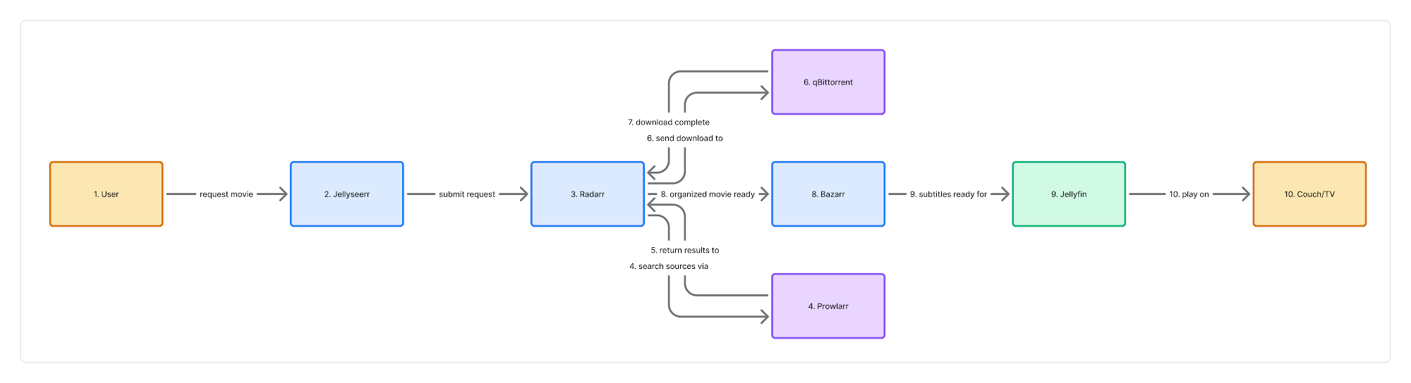 - Jellyfin - the media server itself. Once content is downloaded and organized, Jellyfin makes it available to watch on any device, anywhere.